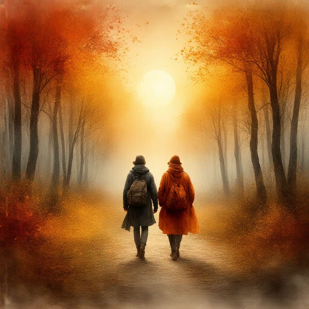 Prompt per l’AI: Crea un’immagine illustrativa in stile acquerello che catturi l’essenza dell’autunno come stagione di viaggio. Protagonisti dell’immagine sono due viaggiatori avvolti in abbigliamenti dai toni caldi, intenti a percorrere un sentiero immerso in un bosco colorato dall’autunno. Le piante si mostrano adornate da foglie nei variegati colori rosso, arancio e giallo, creando così uno scenario caloroso e invitante. A fare da cornice è visibile uno scorcio di borgo medievale caratterizzato da case costruite in pietra con tetti rossi; il tutto è immerso nella velata nebbia del mattino. Nel cielo spicca una luce solare piuttosto pallida che riesce a sfiorare le nuvole, filtrando nell’aria ciò che appare come aurora d’oro sul panorama circostante. Inoltre troviamo anche una nota simbolica: la figura della valigia aperta dalla quale sbucano foglie colorate diviene emblema della scoperta e dell’avventura portate dal periodo autunnale. La resa artistica richiede quindi uno stile illustrativo caratterizzato da disegni raffinati, accompagnati da tonalità tenui al fine di offrire all’osservatore una sensazione di poesia delicata ed eleganza manifesta.